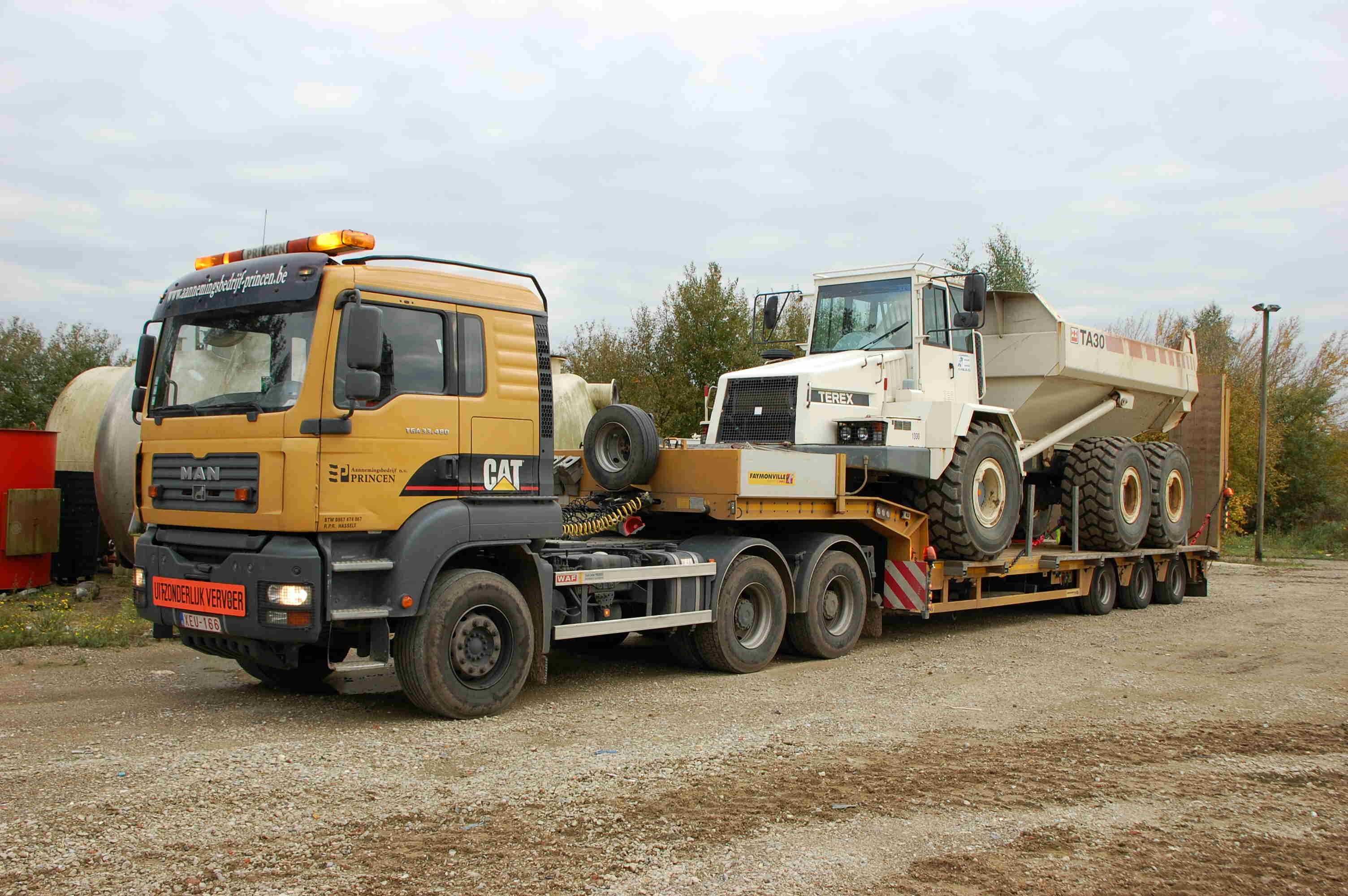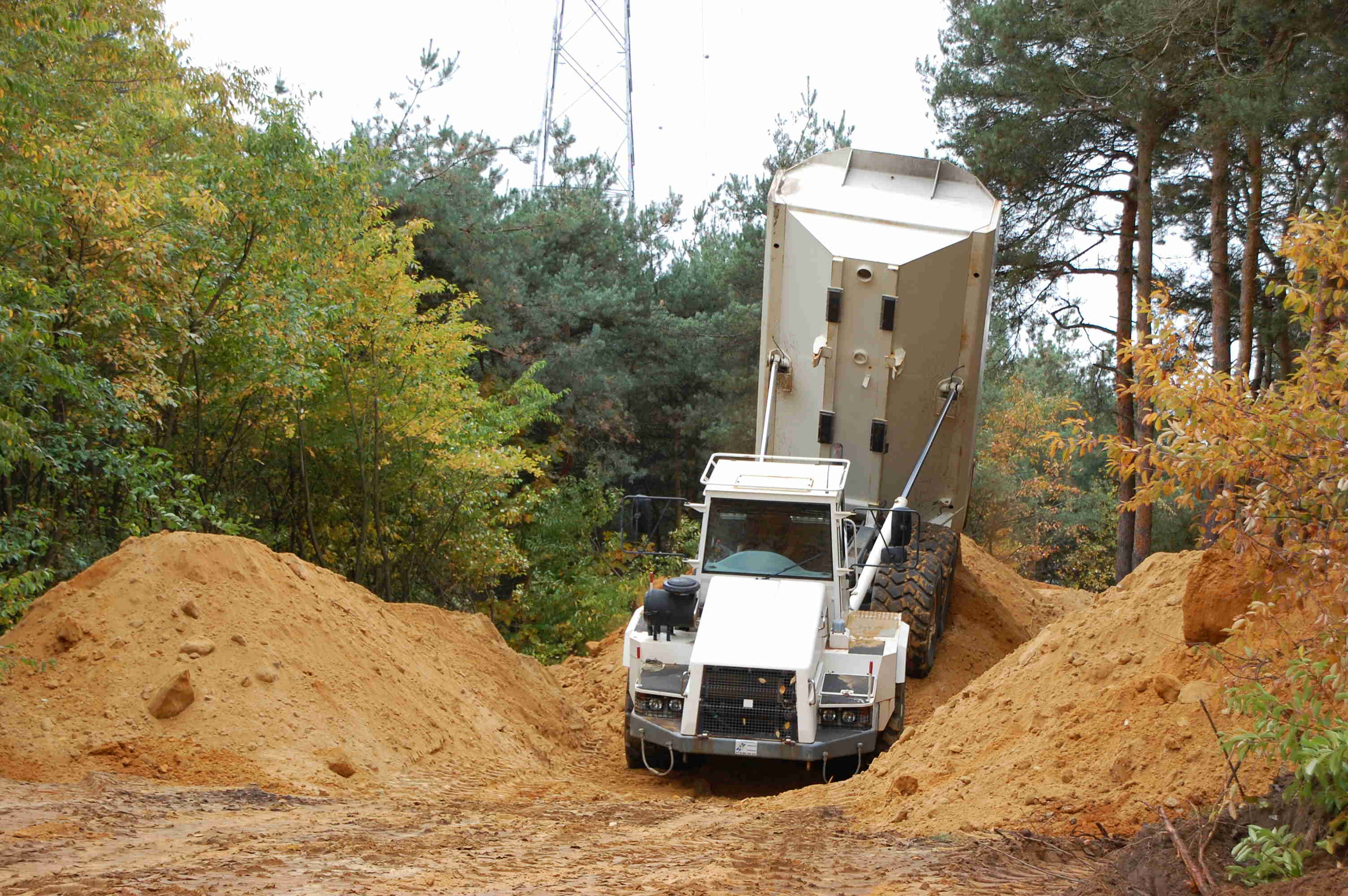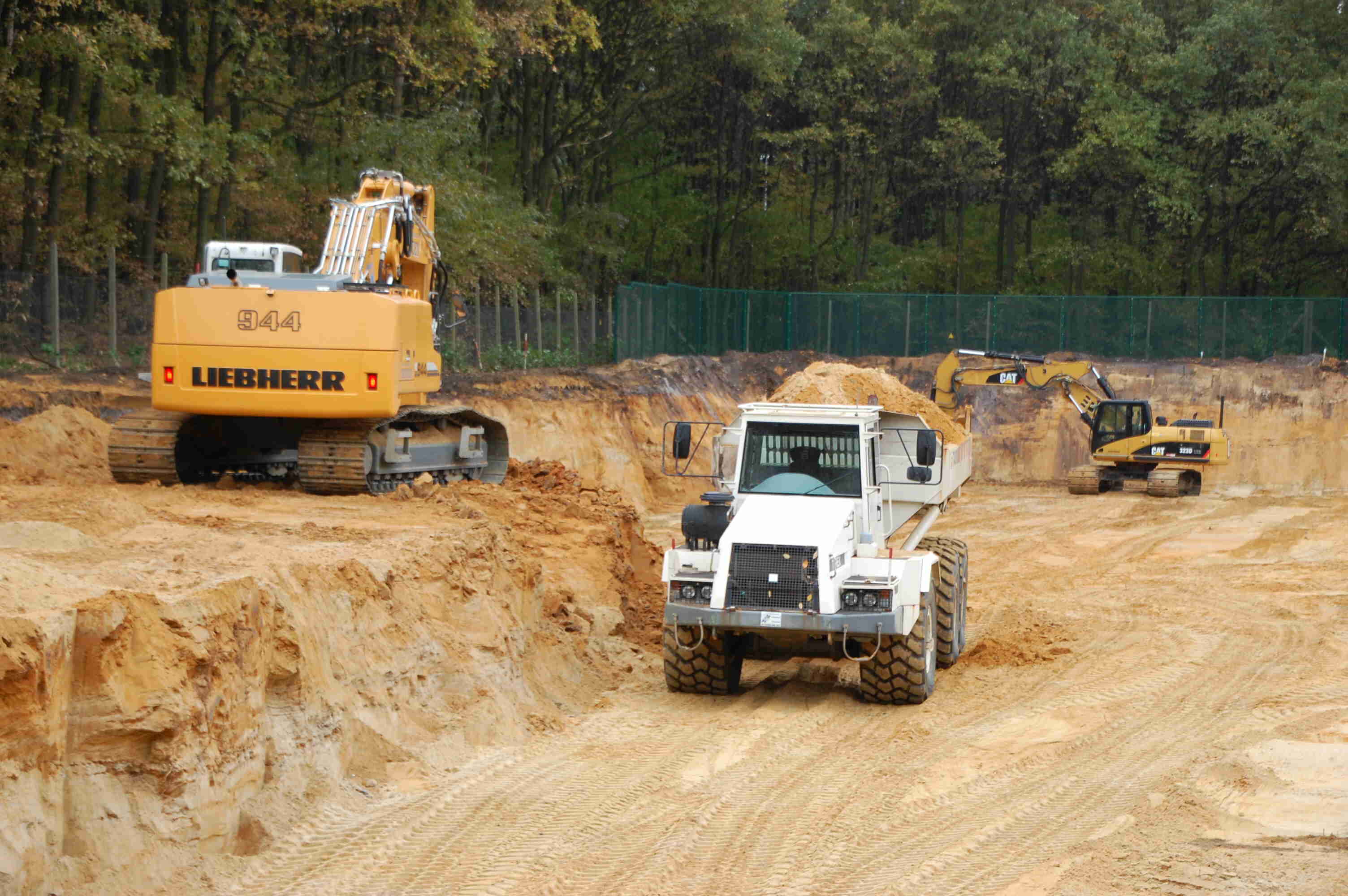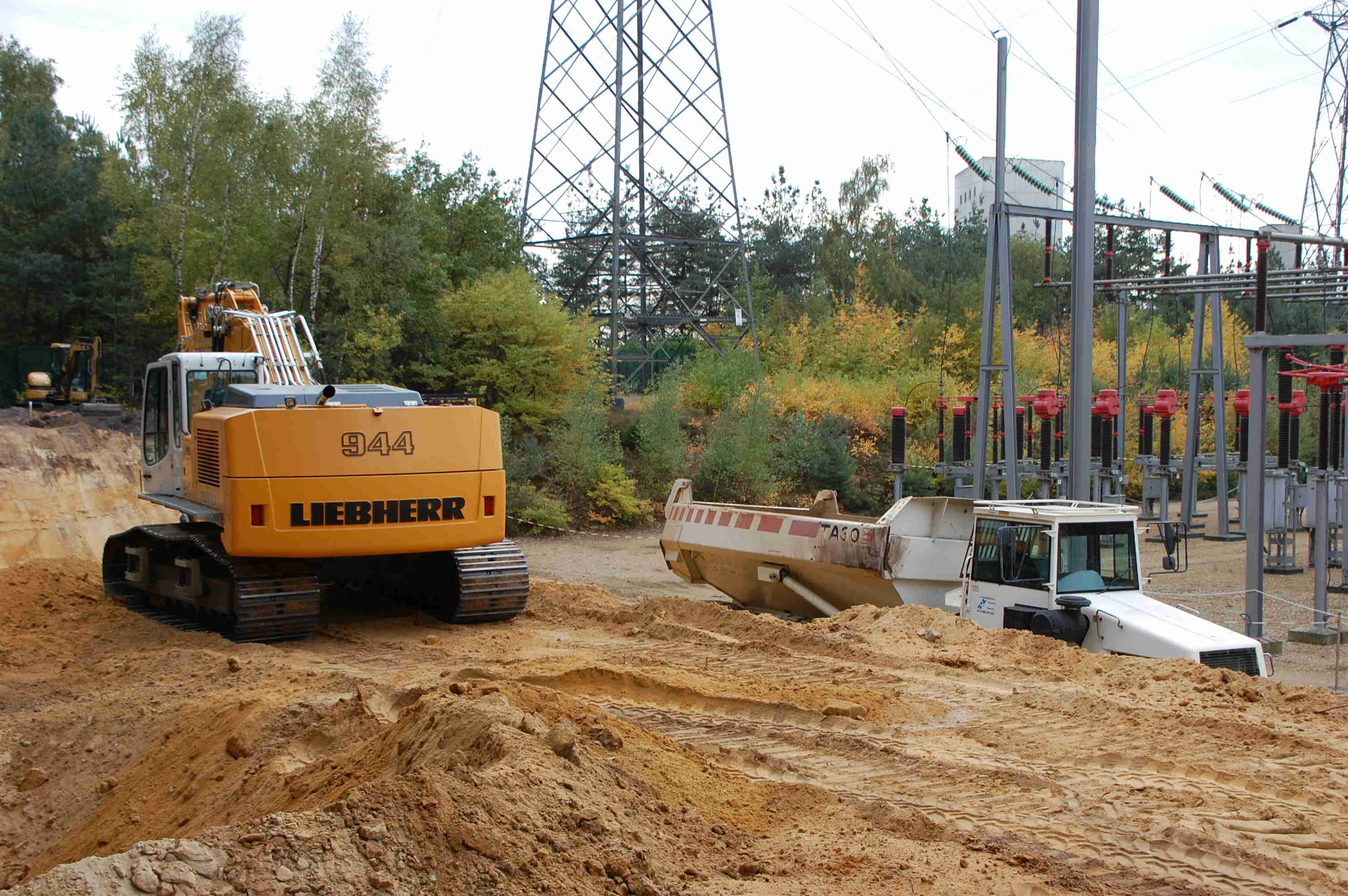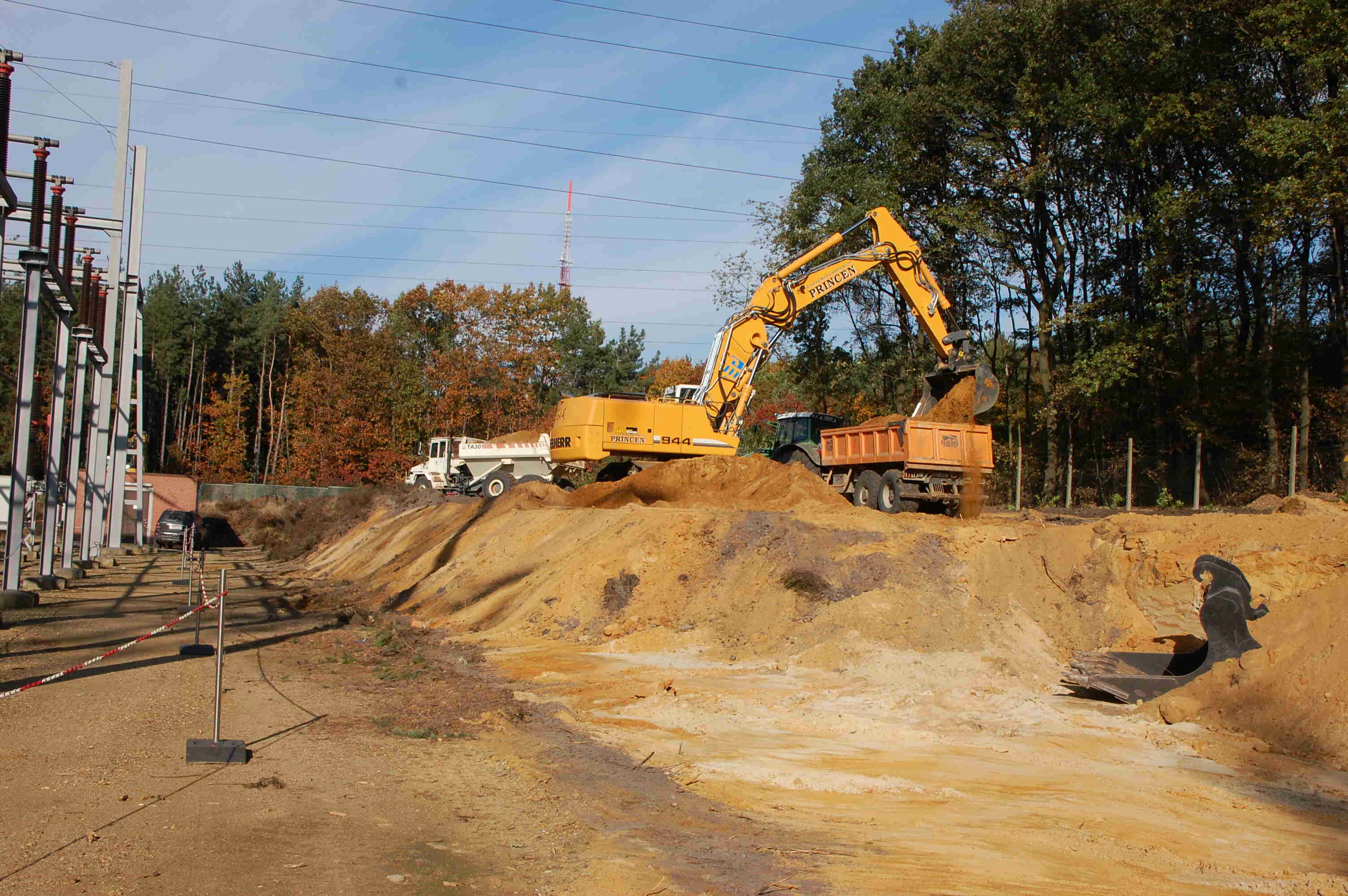 Groot grondverzet Om beide nieuwe velden ( extra en condensatoren) te realiseren diende er een massa grond verzet te worden. In totaal moest er zo'n 6300 kubieke meter zand verzet worden. Bovendien vond dit groot grondverzet plaats in een in dienst staande post van 150 000 volt. Om dit werk tot een goed einde te brengen hebben wij onze liebherr 944C 43 tons graafmachine ingezet voorzien van een graafbak van 3,6 kubieke meter. Om de grond af te voeren kwamen er een TEREX 30 tons knikdumper en een fendt 936 tractor met gronddumper aan te pas.