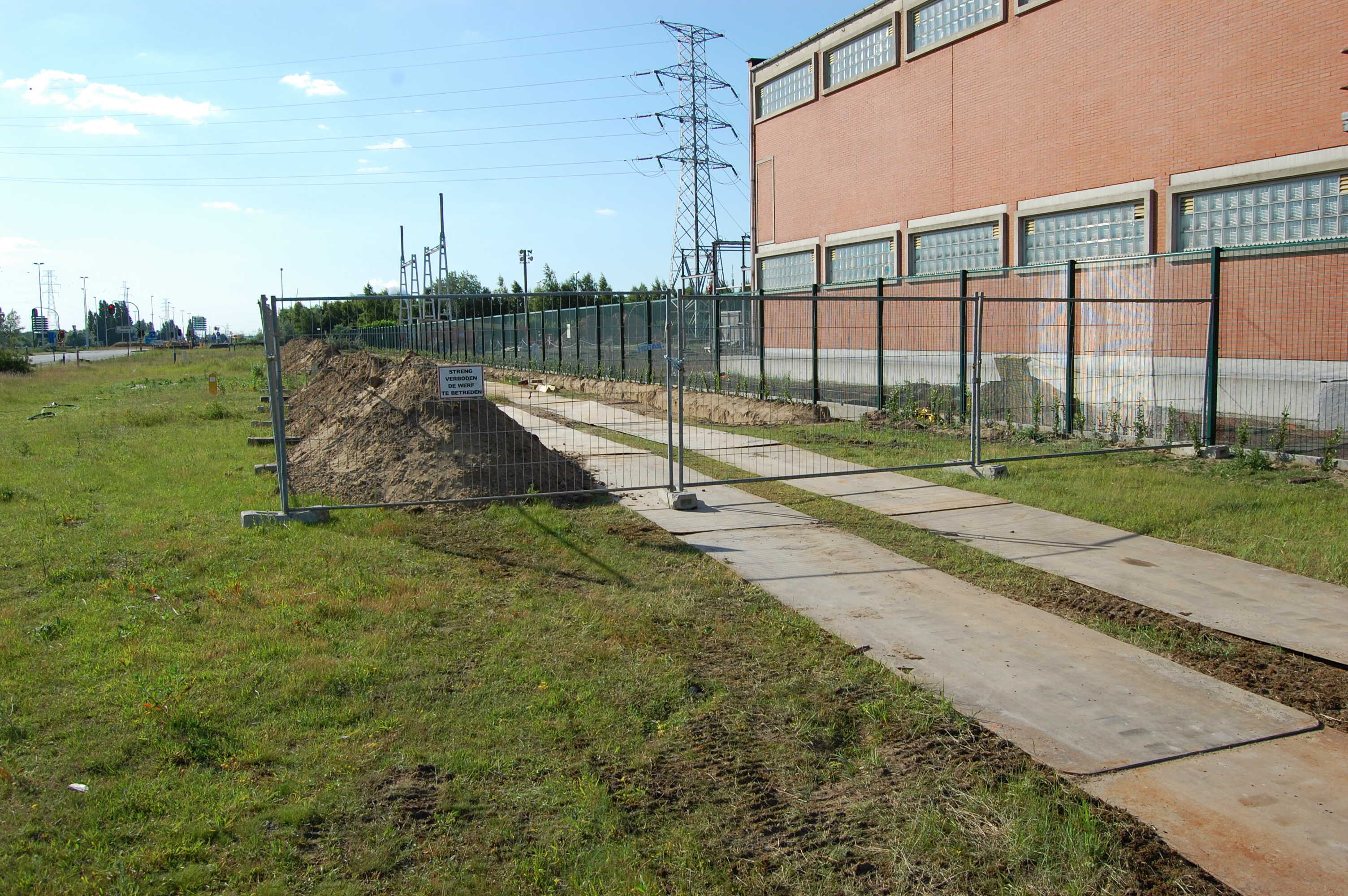 Uitvoering De verbinding zal bestaan uit 3 feeders van 36000 volt geplaatst in een zuiver zandbed. Elke feeder bestaat uit 3 PRC kabels geleverd door Nexans met een sectie van 400 mm² Alu. De verbinding beslaat ongeveer een 120 meter en er dient 7 maal een andere 36 kV verbinding gekruist te worden. De sleuf werd met onze speciale compacte 9 tons Caterpillar 307C SB VA uitgegraven. De aanvul- en nivelleringswerken na het plaatsen van de feeders gebeurde met onze Caterpillar 277B rupslader |